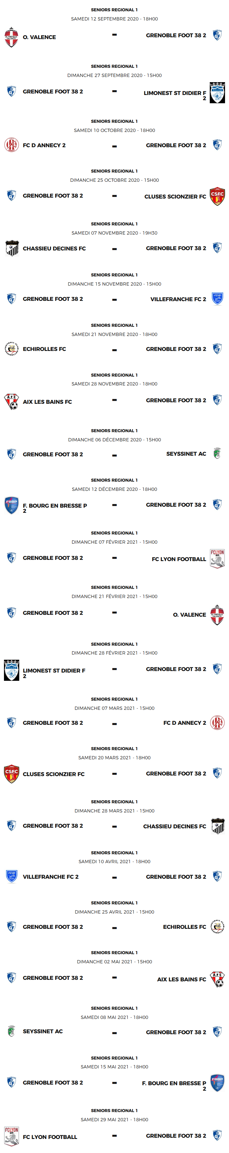Les réservistes grenoblois entreront rapidement dans le vif du sujet cette saison avec un déplacement chez l’Olympique de Valence, le samedi 12 septembre, pour le compte de la première journée du championnat Régional 1. Les troupes de Frédéric Guéguen enchaîneront face à des duels contre d’autres équipes B : à domicile contre Limonest Saint-Didier (27 septembre) puis à Annecy (10 octobre). Pour cause de coupe de France le début de calendrier grenoblois sera donc léger avec seulement 3 matchs en un mois.