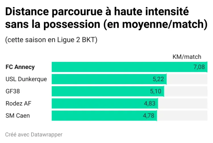 Cette débauche d’énergie à la perte du ballon est également visible à travers les kilomètres parcourus à haute intensité sans ballon. Les coéquipiers de Gaëtan Paquiez ont parcouru 5.10 kilomètres en moyenne par match dans ce domaine, loin des Annéciens qui figurent là aussi en tête de ce classement avec 7.08 kilomètres de moyenne.