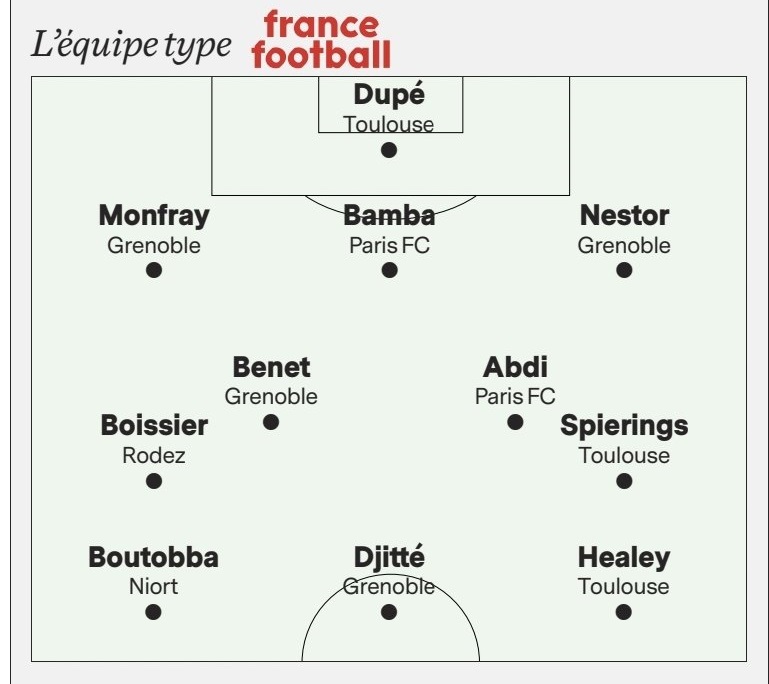 Nouveau record du club ! Le GF38 a réussi à placer 4 joueurs dans l’équipe-type de la semaine après sa nette victoire face à Dunkerque : les défenseurs Loic Nestor et Adrien Monfray, le milieu de terrain Jessy Benet et l’attaquant Moussa Djitté. Un beau tir groupé, symbolique, mais qui fait plaisir quelques jours après avoir réussi à se hisser en tête du championnat.