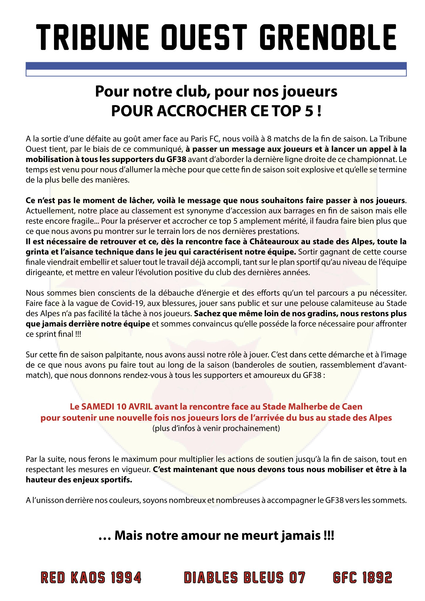 Les groupes ultras grenoblois (GFC 1892, Diables Bleus 07 et Red Kaos 94) ont co-signé un communiqué dans lequel ils lancent un appel « à la mobilisation à tous les supporters du GF38 » pour soutenir l’équipe dans une fin de saison qui s’annonce passionnante et pour laquelle les joueurs de Philippe Hinschberger peuvent toujours espérer une qualification pour les barrages, voir un peu plus.