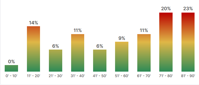 On peut surenchérir sur cet aspect « diesel » en relevant que 54% des buts de Grenoble sont inscrits dans la dernière demi-heure et plus particulièrement dans les 20 dernières minutes (43%). La dernière tranche de 10 minutes (80-90′) est même la plus prolifique pour Grenoble.