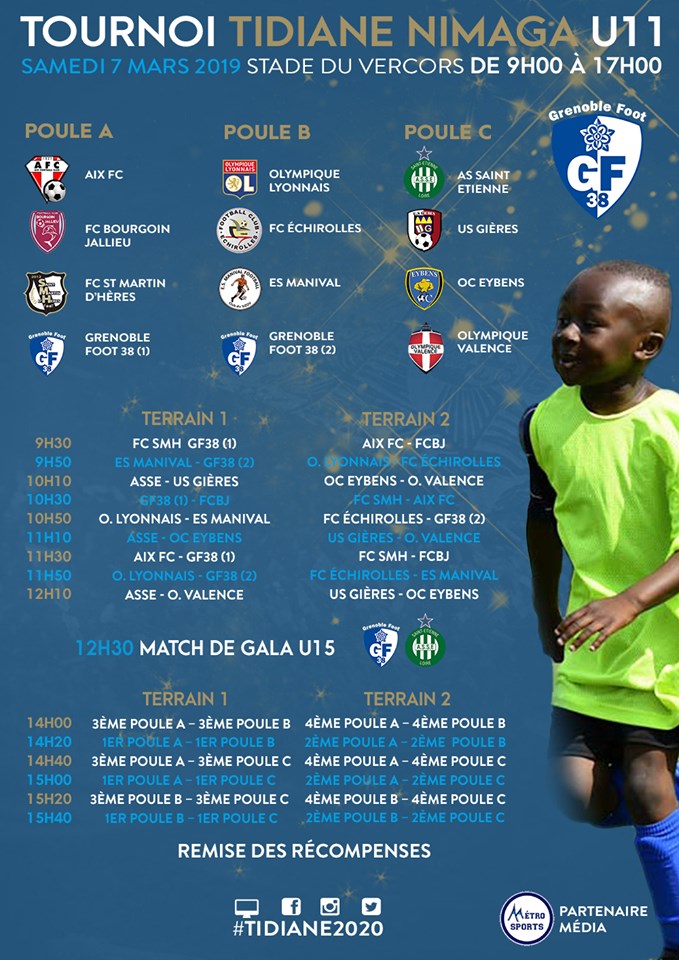 L’édition 2020 du tournoi Tidiane Nimaga, qui aura lieu le samedi 7mars prochain, réunira 12 équipes U11 : deux formations du GF38 ainsi que l’Association Sportive de Saint-Étienne, l’ES Manival, Saint Martin d’Hères FC, le FC Bourgoin-Jallieu, le FC Échirolles, l’Olympique Valence, l’OC Eybens, l’Olympique Lyonnais, l’US Gières et Aix FC (Aix Les Bains).