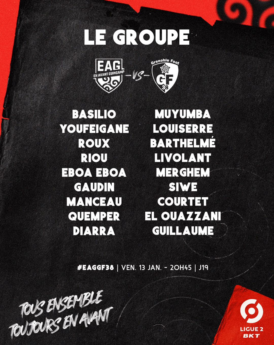 L’entraîneur de Guingamp Stéphane Dumont a convoqué 18 joueurs pour préparer la rencontre de la 19ème journée de Ligue 2 face au GF38.