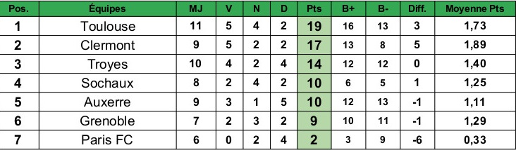 Et… pas vraiment de surprise : les trois premiers du classement de Ligue 2 sont les trois meilleurs lors des chocs. Pas dans le même ordre en revanche ! C’est en effet Clermont qui mène la danse, devant Toulouse et l’ESTAC est un peu à la traine jusque là. Et si c’était ce qui coûtait la montée à Troyes en fin de saison ?